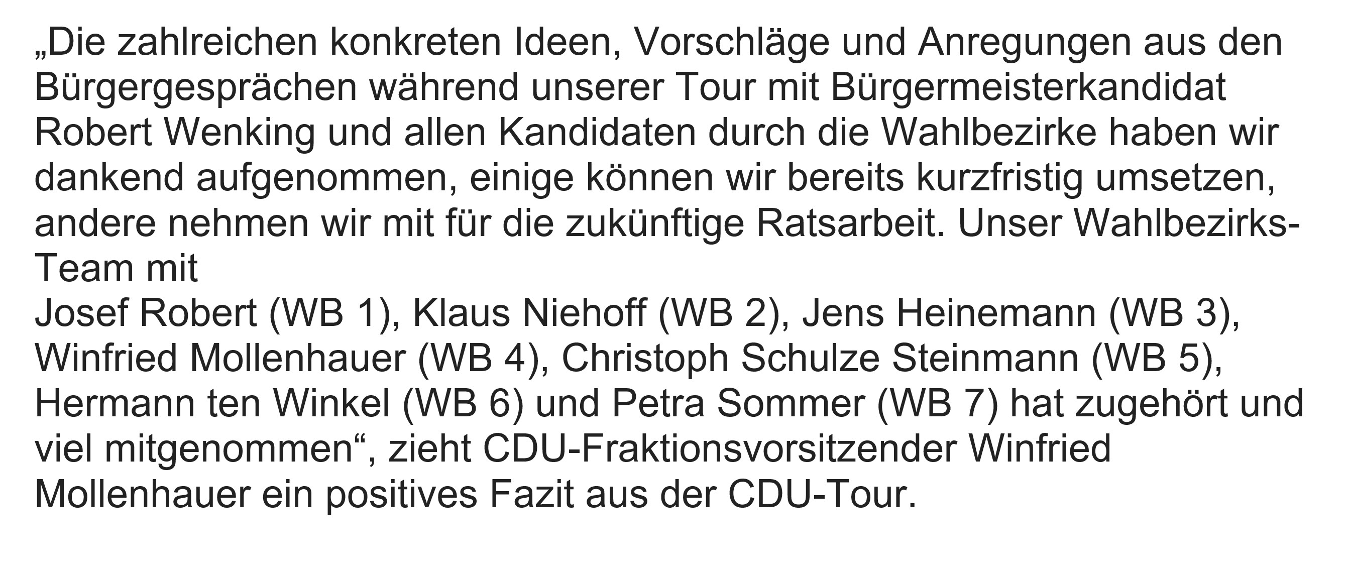 miteinbeziehen und haben am Anfang des Mobilitätskonzeptes auf eine Bürgerbeteiligung gesetzt, um zu erfahren, welche Schwerpunkte sich dort herauskristallisieren“, informiert CDU-Fraktionsvorsitzender Mollenhauer